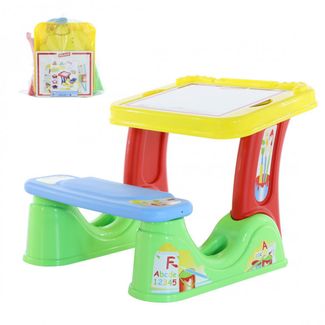 Парта соединена со скамейкой. Поверхность стола – съемная пластиковая панель, под которой находится органайзер для канцелярских принадлежностей. None