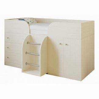 Оригинальная конструкция этой кровати-чердака понравится как малышам, так и их родителям.Особенность модели — выдвижная по центру лесенка, внутри которой скрывается небольшой шкафчик со штангой.В нем можно не только хранить вещи, но и использовать элемент во время игры.В верхней части располагается удобная кроватка с бортиками, внизу есть комод с тремя ящиками и распашной шкаф с полкой.Большое количество мест для хранения вещей и игрушек поможет малышу самому научиться наводить порядок.Комплекс имеет компактные размеры и станет идеальным вариантом для небольшой детской комнаты.Все края имеют безопасные скругления.Основание кровати — настил из ЛДСП.Модуль универсальный: его можно собрать как на правую, так и на левую сторону.Перекладины на лестнице - металл. Работаем круглосуточно!Возврат 21 день. Страна производства: Россия Есть доставка.