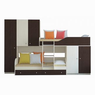 Кровать двухъярусная Лео. Такая модель практично решает вопрос организации пространства и хранения вещей, освобождая больше мест для активных игр. Разнообразие цветовых решений позволяет подобрать комплекс под любой интерьер.Комплекс оснащен двумя удобными кроватями: верхняя оборудована безопасным бортиком, а под нижней располагается два выдвижных ящика для постельных принадлежностей.В модуле предусмотрено два средних шкафа с полками и шкаф-пенал с выдвижной штангой для вешалок. Наличие такой системы хранения вещей и одежды поможет детям научиться самим наводить порядок в комнате.Основание кроватей - настил из ЛДСП.Комплекс универсальный, поэтому его можно собрать как на правую, так и на левую сторону Изделие производится из ЛДСП толщиной 16 мм. Края обработаны кромкой ПВХ 0,4 и 2 мм. Перекладины у лестницы - металл. Работаем круглосуточно!Возврат 21 день. Страна производства: Россия Есть доставка.