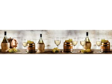 Стеновая панель SP-115 — прекрасный вариант для декорирования рабочей поверхности кухни. Дубовые бочки, гроздья винограда и белое вино в изящных бокалах создают приятную атмосферу. За панелью легко ухаживать, при этом она выдерживает высокую влажность и перепады температуры.<br>