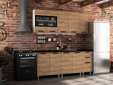 Кухонный гарнитур Крафт 200 см идеально впишется в современный интерьер в стиле лофт. Изящества и элегантности добавляют четкие геометрические линии, массивные ручки под металл и фасады с текстурой дерева.<br>