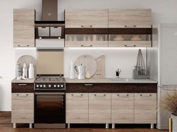 В комплект входят (ВхШхГ): <br> навесной шкаф с витриной, 2 шт.: 720 х 800 х 304 мм;<br> узкий навесной шкаф: 720 х 400 х 304 мм;<br> напольный шкаф под мойку: 846 х 800 х 600 мм;<br> напольный шкаф с ящиком: 846 х 800 х 600 мм;<br> напольный шкаф с ящиком: 846 х 400 х 600 мм;<br> столешница: 26 х 400 х 600 мм;<br> столешница: 26 х 800 х 600 мм.<br>