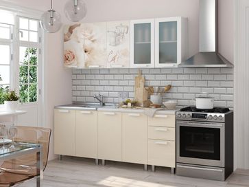 Кухонный гарнитур Латте 200 см с фотопечатью выполнен в теплых тонах, что придаст интерьеру нежности и уюта. Общая ширина модулей составляет 2000 мм, по желанию шкаф с мойкой можно расположить отдельно.<br>