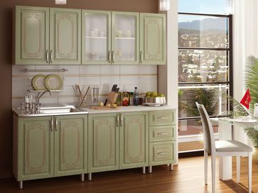Свежий взгляд на классику — кухонный гарнитур Престиж Люкс 2,0 м. Нежный мятный оттенок фасадов с резным декором и украшениями в виде изящных узоров создаст на вашей кухне уютную атмосферу.<br>