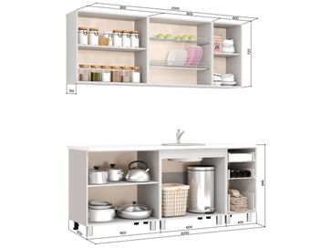 В состав гарнитура входят:<br> навесной шкаф с витриной (ВхШхГ): 720 х 800 х 310 мм;<br> навесной шкаф (ВхШхГ): 720 х 800 х 310 мм;<br> узкий навесной шкаф (ВхШхГ): 720 х 400 х 310 мм;<br> шкаф под мойку (ВхШхГ): 820 х 800 х 500 мм;<br> напольный шкаф (ВхШхГ): 820 х 800 х 500 мм;<br> напольный шкаф с ящиками (ВхШхГ): 820 х 400 х 500 мм;<br> столешница (ВхШхГ): 26 х 2000 х 600 мм.<br> <br>