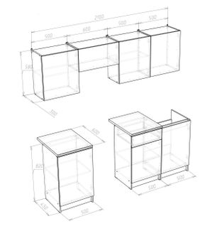 Три кухонных стола имеют ширину 500 мм. Два из них комплектуются столешницей размером 500 х 600 мм, внутри — полка; третий стол предполагает установку накладной мойки шириной 500 мм.<br>