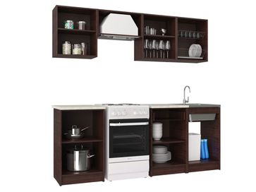 В составе гарнитура есть шкаф над вытяжкой шириной 600 мм и три навесных шкафа шириной 500 мм: два из них с полками, третий предполагает установку сушки для посуды.<br>