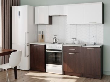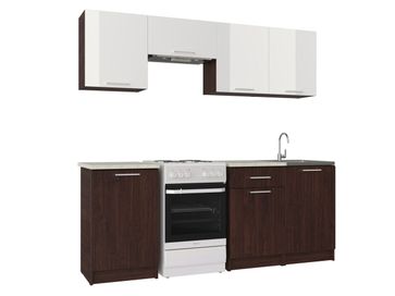 Готовый прямой кухонный гарнитур Дальма 210 см создан в стильном сочетании благородных темных фасадов для нижних шкафов и модных глянцевых белых фасадов у навесных шкафчиков. Такая кухня придется по вкусу тем, кто любит эклектические детали для оформления интерьера.<br>