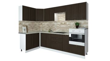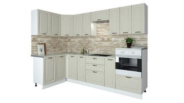 Состав комплекта (ВхШхГ): <br> Навесной шкаф с двумя дверками: 700 х 600 х 300 мм.<br> Навесной угловой шкаф: 700 х 600 х 600 мм.<br> Навесной шкаф с одной дверкой: 700 х 400 х 300 мм.<br> Малый навесной шкаф: 350 х 600 х 300 мм.<br> Узкий навесной шкаф (2 шт.): 700 х 300 х 300 мм.<br> Навесной шкаф с двумя дверками: 700 х 800 х 300 мм.<br> Шкаф-полупенал для встраиваемой техники: 1000 х 600 х 440 мм.<br> Напольный шкаф с тремя ящиками: 830 х 600 х 440 мм.<br> Напольный шкаф с дверкой (2 шт.): 830 х 300 х 440 мм.<br> Угловой напольный шкаф под мойку: 830 х 1000 х 440 мм.<br> Напольный шкаф с двумя дверками: 830 х 800 х 440 мм.<br> <br>