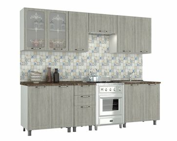 Кухонный гарнитур Прованс 250 см для просторной кухни.<br> Корпуса комплекта изготовлены из ЛДСП толщиной 16 мм, а фасады выполнены из МДФ и покрыты пленкой ПВХ. Дверцы крепятся на накладные петли, а выдвижные ящики оснащены шариковыми направляющими полного выдвижения.<br> В комплект входят: <br> Стол под накладную мойку двухдверный (ВхШхГ): 830 х 800 х 440 мм;<br> Стол двухдверный (ВхШхГ): 830 х 800 х 440 мм;<br> Стол с тремя ящиками (ВхШхГ): 830 х 400 х 440 мм;<br> Шкаф однодверный навесной (ВхШхГ): 700 х 400 х 300 мм;<br> Шкаф двухдверный навесной (ВхШхГ): 700 х 800 х 300 мм;<br> Шкаф двухдверный навесной со стеклом (ВхШхГ): 700 х 800 х 300 мм;<br> Шкаф антресольный навесной (ВхШхГ): 350 х 500 х 300 мм;<br> Декоративные хромированные опоры для установки без цоколя;<br> Антресольный шкаф оснащен одним газовым кронштейном.<br>