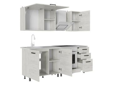 В комплект входят (ВхШхГ): <br> Шкаф 2 двери: 626 х 1000 х 317 мм.<br> Шкаф 1 дверь: 626 х 400 х 317 мм.<br> Тумба с ящиками: 820 х 400 х 445 мм.<br> Тумба под технику: 820 х 1000 х 445 мм.<br> Тумба под мойку: 820 х 1000 х 445 мм.<br> Столешница, 2 шт.: 26 х 1000 х 600 мм.<br>