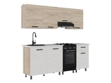В комплект входят (ВхШхГ): <br> Шкаф 1 дверь: 626 х 500 х 317 мм.<br> Шкаф под вытяжку: 626 х 500 х 317 мм.<br> Шкаф 2 двери: 626 х 1000 х 317 мм.<br> Тумба с ящиком: 820 х 500 х 445 мм.<br> Тумба под мойку: 820 х 1000 х 445 мм.<br> Столешница: 26 х 1000 х 600 мм.<br> Столешница: 26 х 500 х 600 мм.<br>