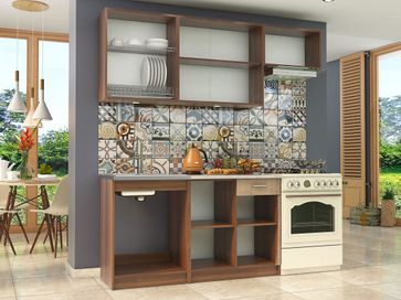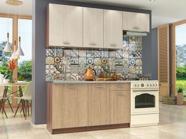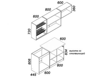 В комплект входят (ВхШхГ): <br> Шкаф-мойка напольная однодверная: 808 х 600 х 445 мм.<br> Шкаф напольный с выдвижным ящиком: 808 х 800 х 445 мм.<br> Шкаф-сушка навесной с поддоном: 720 х 600 х 285 мм.<br> Шкаф навесной двустворчатый: 720 х 800 х 285 мм.<br> Шкаф навесной: 360 х 600 х 285 мм.<br> Столешница: 26 х 800 х 600 мм.<br>