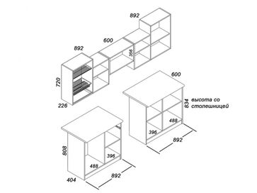 В комплект входят (ВхШхГ): <br> Шкаф напольный под врезную мойку: 808 х 892 х 404 мм.<br> Шкаф напольный: 808 х 892 х 404 мм.<br> Шкаф навесной двухсекционный, 2 шт: 720 х 892 х 226 мм.<br> Шкаф навесной: 356 х 600 х 226 мм.<br> Столешница, 2 шт: 26 х 892 х 600 мм.<br> Сушка с поддоном шириной 500 мм.<br>
