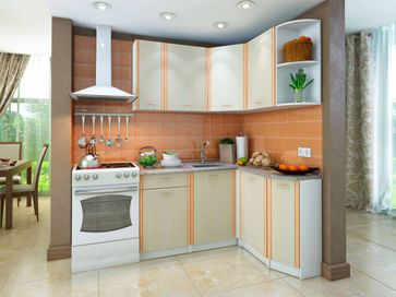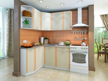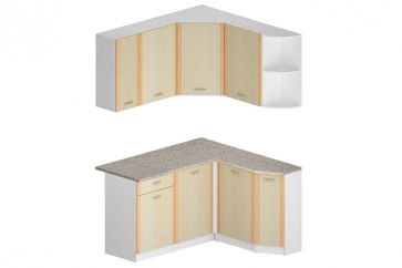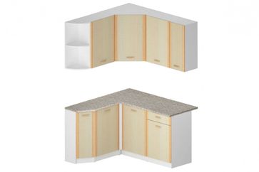 Универсальное решение для кухни любого метража — угловой гарнитур с вместительными и функциональными элементами. В комплект входят четыре напольных шкафа, объединенных столешницей, и пять навесных, включая открытый торцевой стеллаж. В углу удобно расположена мойка.<br> Обе части гарнитура (правая и левая) имеют одинаковую ширину — 1400 мм, а глубина шкафов составляет 600 мм со стороны мойки и 400 мм с торцевой стороны.<br> Столешница выполнена из древесно-стружечной плиты толщиной 26 мм, покрытой пластиками высокого и непрерывного давления: HPL (High Pressure Laminate) и CPL (Continuous Pressure Laminat). Это очень прочные не пористые материалы, они не впитывают запахи, устойчивы к влаге, механическому и химическому воздействию, легко моются.<br>