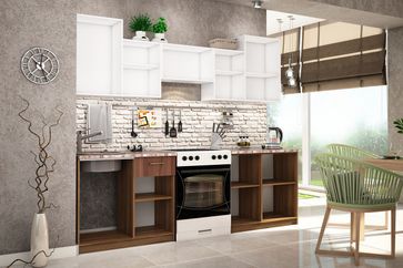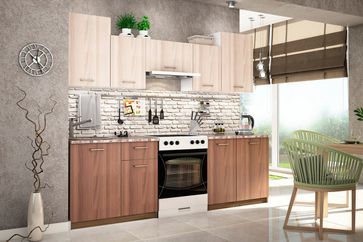 Вместительный, функциональный и практичный гарнитур для небольшой кухни. Его ширина составляет 2385 мм. Комплект включает в себя пять распашных навесных шкафчиков и четыре напольных, соединенных попарно столешницей и образующих две независимые рабочие зоны. В комплекте идет две столешницы размером (ВхШхГ): 26 х 892 х 600 мм.<br> В одной паре объединен шкафчик под мойку и тумба с выдвижным ящиком под столовые приборы, вторая пара представляет собой две распашные тумбы, в каждой по одной полке. </br>Ширина места под мойку — 500 мм.<br /> Нижние тумбы имеют размер (ВхШхГ): 808 х 892 х 404 мм.<br> Столешница выполнена из древесно-стружечной плиты толщиной 26 мм, покрытой пластиками высокого и непрерывного давления: HPL (High Pressure Laminate) и CPL (Continuous Pressure Laminat). Это очень прочные не пористые материалы, они не впитывают запахи, устойчивы к влаге, механическому и химическому воздействию, легко моются.<br> Фасад и каркасы элементов гарнитура выполнены из высокопрочной ЛДСП, устойчивой к температурным перепадам и механическим повреждениям. Крепежная фурнитура выполнена из нержавеющей стали. Ручки — пластик. В ящике используются роликовые направляющие.<br> В комплект входит сушка для посуды с поддоном шириной 500 мм.<br>