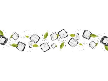Глянцевая стеновая панель F-21 с динамичным изображением летящих кубиков льда и мятных листьев будет заряжать вас бодростью и отличным настроением на весь день. Такая деталь станет дерзким акцентом на современной кухне.<br>