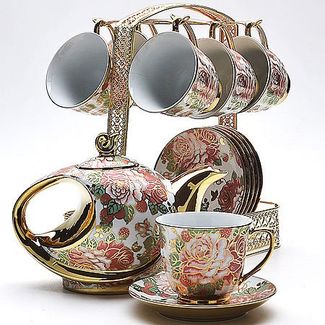 Чайный сервиз на подставке 14 предметов( 6 чашек, 6 блюдец, чайник, подставка с ручкой) Материал: керамика Подставка: железо Рисунок: цветы с позолотой Диаметр: блюдца: 13,5см Объем: чашки: 200мл чайник: 950мл Размер упаковки: 22х18,6х24,3см Вес: 3.1кг None