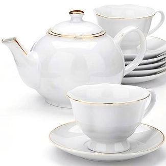 Чайный набор 14 пр LR (х 8 ). Материал: фарфор. Цвет: белый, золотая кайма. Чашка: D 9,5 х 7 см. Блюдце: D 13,5 см. Объем чашек: 200 мл. Объем чайника: 1 л. Размер упаковки: 49 х 27 х 14 см. Упаковка: коробка. Вес: 3,2 кг. Страна производитель: Китай. Чайный набор LORAINE на 6 персон выполнен из высококачественного фарфора белого цвета и украшен тонкой золотой каймой. Изящный дизайн придется по вкусу и ценителям классики, и тем, кто предпочитает утонченность и изысканность. Набор упакован в стильную подарочную коробку, оформленную изнутри белой атласной тканью. Каждый предмет надежно зафиксирован внутри коробки благодаря специальным выемкам. Чайный набор - идеальный и необходимый подарок для Вашего дома и для Ваших друзей в праздники, юбилеи и торжества! Также он станет отличным корпоративным подарком и украшением любой кухни. Подходит для мытья в посудомоечной машине. В наборе: 6 чашек, 6 блюдец и заварочный чайник. None