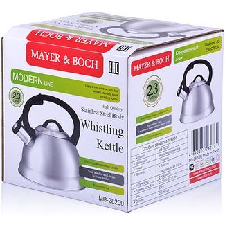 Чайник из нержавеющей стали со свистком МВ (х12). Цвет: серебристый. Материал: нержавеющая сталь CrNi 18/10. Дно: капсулированное/индукционное. Ручка: пластик. Цвет: черный. Объем: 2300 мл. Вес: 630 г. Размер упаковки: 20,5 х 20,5 х 20 см. Страна производитель: Китай.Чайник MAYER& BOCH изготовлен из высококачественной нержавеющей стали (CrNi 18/10). Изделия из нержавеющей стали не окисляются и не впитывают запахи, благодаря чему вы всегда получите натуральный, насыщенный вкус и аромат напитков. Капсулированное дно с прослойкой из алюминия обеспечивает наилучшее распределение тепла. Фиксированная эргономичная ручка выполнена из бакелита, также на ручке расположена клавиша механизма открывания носика. Носик чайника оснащен насадкой-свистком, который позволяет контролировать процесс кипячения или подогрева воды. Поверхность чайника гладкая, что облегчает уход за ним. Эстетичный и функциональный, с современным дизайном, чайник будет замечательно смотреться на любой кухне. Подходит для использования на всех типах плит, включая индукционные. Подходит для мытья в посудомоечной машине. None