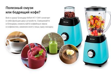 Можно использовать в качестве блендера и кофеварки! Блендер Kitfort KT-1341-1 Чаша блендера сделана из очень прочного стекла и оснащена удобной ручкой. Носик позволяет удобно наливать готовые коктейли в бокалы. Устройство надежно фиксируется на любой горизонтальной поверхности, благодаря небольшим резиновым присоскам. Блендер хранит в арсенале 5 скоростей и работы и импульсный режим, который прекрасно подходит для колки льда. Прибор имеет нож с заостренными зубчатыми лезвиями. Лопасти с зубчиками работают аккуратно, сохраняя клеточную структуру растительных продуктов. А если вы не представляете свою жизнь без ароматного кофе, то вам не придется специально приобретать кофемолку. Блендер с легкостью заменит ее. Цена в интернет магазине Мелеон не может не радовать! Технические характеристики