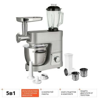 Кухонная машина RKM-M4020 – кухонный прибор «5 в 1», совмещающий в себе функции планетарного миксера, овощерезки, стационарного блендера, мясорубки и машинки для приготовления пасты. Тип управления электромеханический Цвет серый. Максимальная мощность 2500 Вт. Материал корпуса алюминий. Количество скоростей работы 8. Импульсный режим да. Индикация светодиодная. Объем чаши миксера 5 л. Объем кувшина блендера 1,5 л. Количество перфорированных дисков для приготовления фарша 2. Количество насадок для приготовления разных видов пасты 5. Габаритные размеры 355х395х300 мм. None Возможен самовывоз.