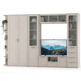 Большая гостиная Бьянка № 11. Комплектация - шкаф угловой, шкаф для одежды, тумба под ТВ, полка широкая навесная и две разных модели пенала. Цвет - ясень анкор светлый. Размер набора мебели (ШхГхВ) 330х46х217 см., размер ниши под ТВ (ШхГхВ) 120х46х98 см. Гостиная, оформленная в неоклассическом стиле - респектабельность и сдержанность одновременно. Универсальная сборка. None Есть доставка.