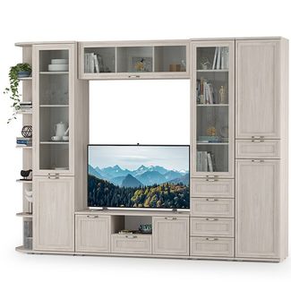 Гостиная Бьянка с угловым окончанием № 10. Комплектация - шкаф угловой, тумба под ТВ, полка широкая навесная и три разных модели пенала. Цвет - ясень анкор светлый. Размер набора мебели (ШхГхВ) 285х46х217 см., размер ниши под ТВ (ШхГхВ) 120х46х98 см. Благородная простота и нежной пастели мебели делают дизайн гостиной эффектным и уютным. Универсальная сборка. None Есть доставка.