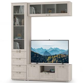 Тумба, полка и пенал со стеклом Бьянка. Артикулы элементов набора мебели - 1704-01+Тумба+10.69. Цвет - ясень анкор светлый. Размер набора мебели (ШхГхВ) 165х46х217 см., размер ниши под ТВ (ШхГхВ) 120х46х98 см. Миниатюрная, практичная стеночка из трёх эргономичных модулей Бьянка поможет создать лёгкий, непринуждённый образ Вашей гостиной. Универсальная сборка. None Есть доставка.