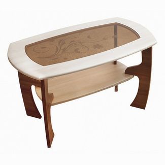 Удобный, красивый столик Маджеста-3. Его отличительные характеристики заключаются в наличии плавных линий, красивом сочетании цветовых решений и в грамотно продуманной конструкции.Оригинальная форма столешницы смотрится ещё более привлекательно благодаря изящной стеклянной вставке, которая украшается растительным пескоструйным рисунком.Фигурные плоские ножки надёжно удерживают полочку, расположенную под столешницей.Все детали модели отличаются прочностью и долговечностью. Работаем круглосуточно!Возврат 21 день. Страна производства: Россия Есть доставка.