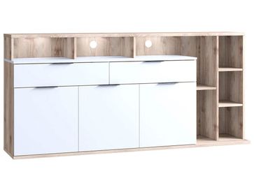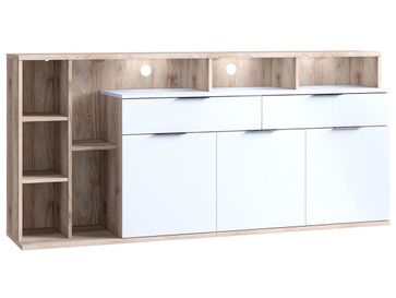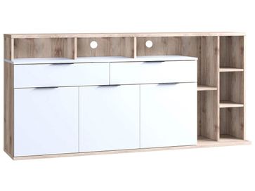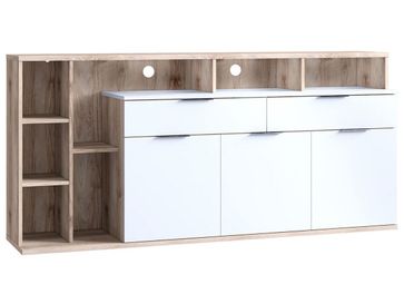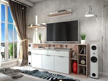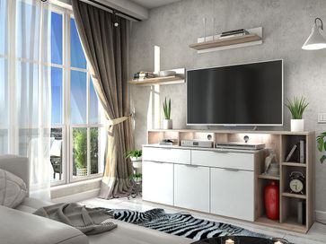 Преимущества: <br> функциональные элементы — отделения с полкой за распашными дверцами, несколько открытых ниш, два выдвижных ящика, две настенные полки;<br> специальные отверстия на задней стенке ТВ-тумбы — удобное и компактное размещение проводов от техники;<br> шариковые направляющие — плавное и бесшумное выдвижение ящиков, долгий срок службы;<br> необычный дизайн — комбинация светлого дерева и белых элементов стильно украсит интерьер.<br>