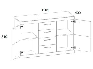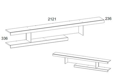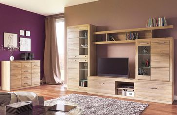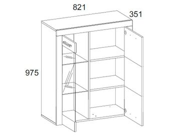 В состав комплекта входят (ВхШхГ): <br> ТВ-тумба: 470 х 2121 х 469 мм.<br> Шкаф-витрина низкая: 975 х 822 х 354 мм.<br> Полка навесная: 336 х 2120 х 236 мм.<br> Комод большой: 810 х 1201 х 403 мм.<br> Шкаф-витрина: 1951 х 822 х 354 мм.<br> <br>
