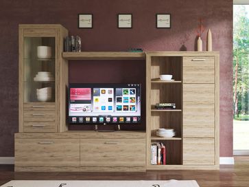 В комплект входят: <br> ТВ-тумба (ВхШхГ): 470 х 1601 х 469 мм.<br> Шкаф комбинированный (ВхШхГ): 1490 х 921 х 354 мм.<br> Полка навесная (ВхШхГ): 336 х 801 х 252 мм.<br> Пенал-витрина (ВхШхГ): 1363 х 521 х 354 мм.<br> <br>