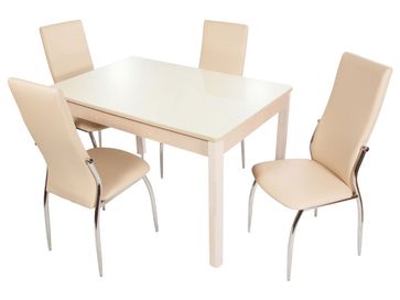 Характеристики: <br> Материал столешницы и вставки: МДФ 18 мм, закаленное стекло 4 мм.<br> Материал подстолья: ЛДСП 18 мм.<br> Материал ножек: массив березы.<br> Механизм трансформации: синхронно-раздвижной.<br> Размер стола в разложенном виде (ВхШхГ): 740 х 1515 х 800 мм.<br> Вместимость: 4 персоны.<br> Материал каркаса стульев: металл.<br> Материал обивки стульев: экокожа.<br> Внутреннее наполнение: пенополиуретан.<br> Размер сиденья (ШхГ): 450 х 390 мм.<br> Высота сиденья от пола: 480 мм.<br> Пластиковые подпятники на опорах.<br> Максимальная нагрузка на стул: 100 кг.<br>