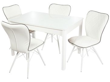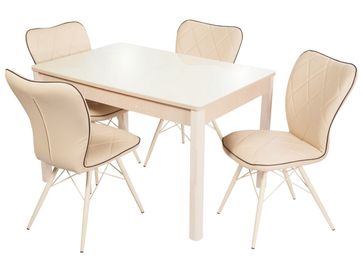 Характеристики: <br> Материал столешницы: МДФ 18 мм, покрытая каленым стеклом 4 мм.<br> Материал вставки: закаленное стекло.<br> Материал подстолья: ЛДСП 18 мм.<br> Материал опор: массив березы.<br> Механизм трансформации: синхронно-раздвижной со вставкой «бабочка» из ЛДСП.<br> Размер в сложенном виде (ВхШхГ): 740 х 1200 х 800 мм.<br> Размер в разложенном виде (ВхШхГ): 740 х 1515 х 800 мм.<br> Ширина вставки: 315 мм.<br> Размер опор: 25 х 50 мм, толщина стенки — 1,5 мм.<br> Материал каркаса стульев: металл, покрытый порошковой краской.<br> Толщина стенок опор: 1,5 мм.<br> Материал обивки и декоративных вставок: искусственная кожа.<br> Материал наполнения сидений: пенополиуретан.<br> Высота сиденья от пола: 450 мм.<br> Максимальная нагрузка: 100 кг.<br>