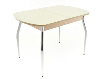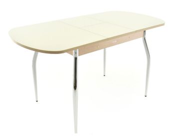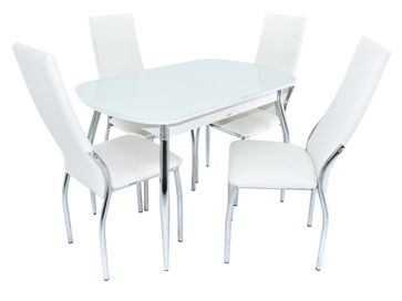 Характеристики: <br> Материал столешницы и вставки: МДФ 18 мм, закаленное стекло 4 мм.<br> Материал подстолья: ЛДСП 18 мм.<br> Материал ножек: хромированный металл.<br> Механизм трансформации: синхронно-раздвижной.<br> Вместимость: 4 персоны.<br> Размер в разложенном виде (ВхШхГ): 742 х 1420 х 700 мм.<br> Материал каркаса стульев: металл.<br> Материал обивки стульев: экокожа.<br> Внутреннее наполнение: пенополиуретан.<br> Размер сиденья (ШхГ): 430 х 370 мм.<br> Высота сиденья от пола: 480 мм.<br> Максимальная нагрузка: 70 кг.<br> <br> Чтобы разложить стол, нужно раздвинуть две части столешницы, достать из подстолья дополнительную вставку «бабочка» и установить между крыльев столешницы. Синхронный механизм трансформации позволяет раздвинуть столешницу одной рукой. None Страна производства: Россия