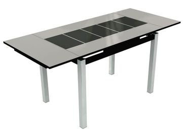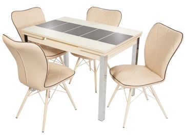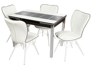 Характеристики: <br> Материал столешницы и подстолья: ЛДСП 18 мм.<br> Материал покрытия столешницы: закаленное стекло 4 мм.<br> Материал ножек стола: хром.<br> Механизм трансформации: металлический каркас, оснащенный выдвижными полками для вставок.<br> Размер в сложенном виде (ВхШхГ): 790 х 1100 х 740 мм.<br> Размер в разложенном виде (ВхШхГ): 790 х 1700 х 740 мм.<br> Ширина вставки: 600 мм.<br> Размер опор стола: 25 х 50 мм, толщина стенки — 1,5 мм.<br> Материал каркаса стульев: металл, покрытый порошковой краской.<br> Толщина стенок опор: 1,5 мм.<br> Материал обивки и декоративных вставок: искусственная кожа.<br> Материал наполнения сидений: пенополиуретан.<br> Высота сиденья от пола: 450 мм.<br> Максимальная нагрузка: 100 кг.<br>