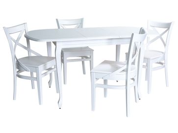 Состав комплекта: <br> обеденный стол (ВхШхГ): 740 х 1100/1420 х 700 мм;<br> стул, 4 шт. (ВхШхГ): 990 х 410 х 410 мм.<br>