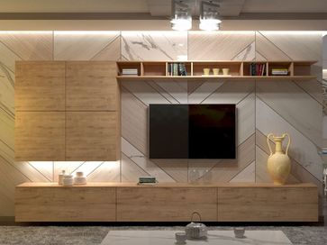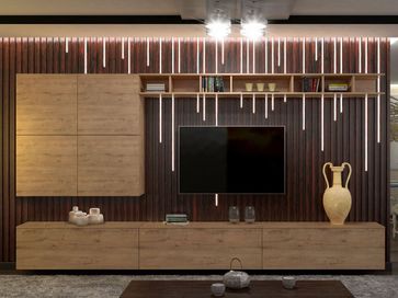 В комплект входят (ВхШхГ): <br> ТВ-тумба, 3 шт.: 350 х 1200 х 446 мм.<br> Навесной шкаф, 4 шт.: 600 х 600 х 350 мм.<br> Настенная полка, 2 шт.: 200 х 1200 х 334 мм.<br>