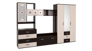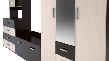 Функциональная гостиная Белла с декоративными вставками на фасадах очень практична: секция со штангой для вешалок и пенал для белья помогут разгрузить спальню. В выдвижных ящиках комода удобно хранить одежду, а в маленьких — канцелярию, пульт и прочие небольшие вещи. Фасады украшают декоративные вставки и большое зеркало. Асиметричная форма центральной секции визуально делает гостиную компактнее, а открытые полки и большая ТВ-ниша придают ей легкости.<br>