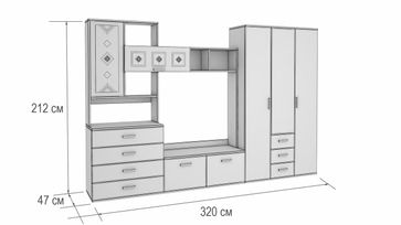 В состав комплекта входят (ВхШхГ): <br> Распашной шкаф: 2120 х 1200 х 470 мм.<br> Гостиная: 2120 х 2000 х 470 мм.<br>