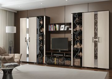 Яркая и необычная гостиная Флоренция с декоративными стеклянными фасадами и вставками. Фасады украшены витиеватым рисунком (пескоструйная обработка), ручки — стразами Swarovski.<br> Декоративные шкафы-витрины имеют 6 полок внутри. Крупный рисунок и темный цвет стекла частично скрывают его содержимое, благодаря чему в нем можно хранить не только красивые сувениры и посуду, но и обычные вещи, необходимые в повседневной жизни.<br> Длинные современные ручки удобны в использовании, при этом не отвлекают внимания от основного декора гарнитура.<br> Вместительная и функциональная гостиная будет особенно полезна в небольшой квартире, поможет освободить спальню от шкафов.<br>