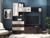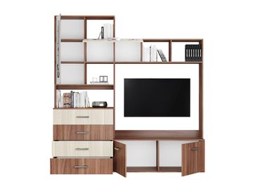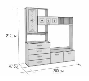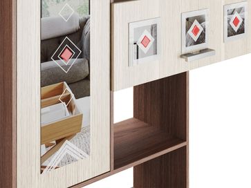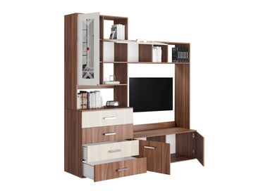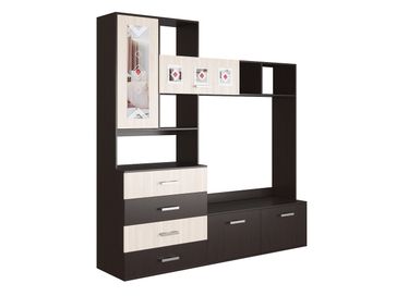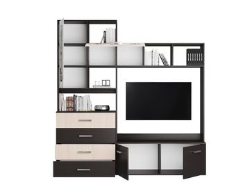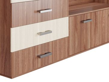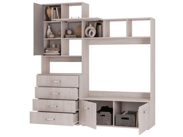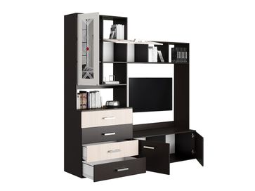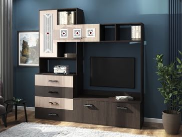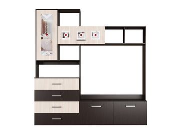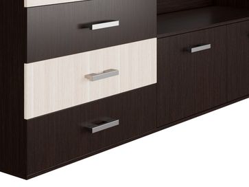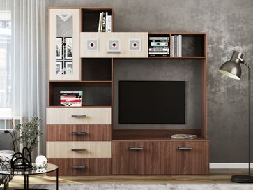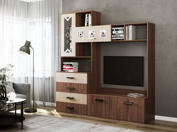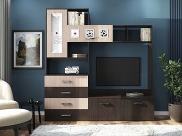 Ассиметричная форма и открытые полки стенки визуально делают ее компактнее и легче. В основании предусмотрен комод с четырьмя ящиками, а также вместительное отделение за откидными дверцами.<br>