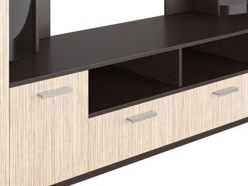 Характеристики:<br> Материал каркаса: ЛДСП, кромка ABS.<br> Материал фасада: ЛДСП, стекло, кромка ABS.<br> Материал ручек: пластик ABS.<br> Размер ниши под ТВ: 1200 х 452 мм.<br> Высота полок под телевизором: 200 мм.<br> Тип направляющих: роликовые 500 мм.<br> Ориентация сборки: только так, как представлено на изображении.<br> С инструкциями по сборке можно ознакомиться на страницах отдельных моделей.<br> None Страна производства: Россия