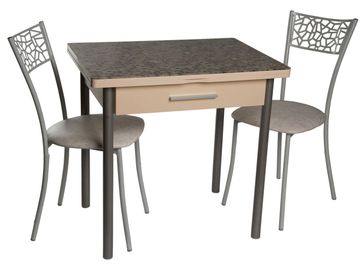 Характеристики: <br> Материал столешницы: ЛДСП 32 мм, закаленное стекло 4 мм.<br> Материал подстолья: ЛДСП.<br> Материал ножек стола и каркаса стула: металл.<br> Материал обивки сиденья: экокожа.<br> Размер сиденья (ШхГ): 380 х 400 мм.<br> Высота сиденья от пола: 470 мм.<br> Максимальная нагрузка на стул: 100 кг.<br> Механизм трансформации стола: поворотно-раскладной.<br> Ящик для хранения: предусмотрен.<br> Размер стола в разложенном виде (ВхШхГ): 750 х 1200 х 800 мм.<br>