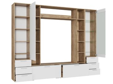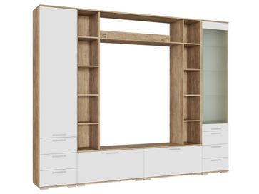 В комплект входят (ВхШхГ): <br> Распашной шкаф с тремя ящиками: 2146 х 450 х 382 мм.<br> Открытый стеллаж, 2 шт.: 1716 х 300 х 378 мм.<br> Большая ТВ-тумба, 2 шт.: 430 х 900 х 382 мм.<br> Настенная полка: 160 х 1200 х 356 мм.<br> Полка-менсола: 22 х 1200 х 378 мм.<br> Шкаф-витрина с двумя ящиками: 2146 х 450 х 382 мм.<br><br>С инструкциями по сборке можно ознакомиться на страницах отдельных моделей.<br>
