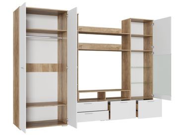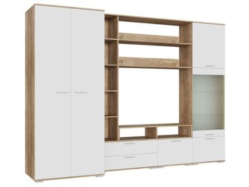 В комплект входят (ВхШхГ):<br> <br> Распашной шкаф: 2146 х 900 х 584 мм.<br> Открытый стеллаж: 1716 х 300 х 378 мм.<br> Большая ТВ-тумба: 430 х 900 х 382 мм.<br> Малая ТВ-тумба: 430 х 600 х 382 мм.<br> ТВ-надстройка: 176 х 1202 х 358 мм.<br> Настенная полка, 2 шт.: 160 х 1200 х 356 мм.<br> Полка-менсола: 22 х 1200 х 378 мм.<br> Шкаф-витрина: 2146 х 600 х 382 мм.<br>