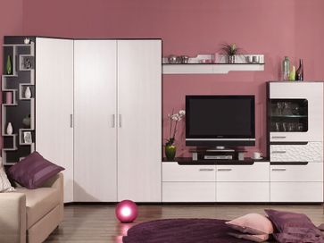В состав комплекта входят (ВхШхГ): <br> Угловой шкаф: 2113 х 783 х 783 мм.<br> Распашной шкаф (2 шт.): 2113 х 560 х 400 мм.<br> Малый шкаф-витрина: 1564 х 692 х 400 мм.<br> ТВ-тумба: 566 х 1382 х 400 мм.<br> Настенная полка (2 шт.): 250 х 688 х 166<br> Настенный стеллаж-полка: 1991 х 560 х 120 мм.<br> Подсветка для шкафа-витрины.<br>