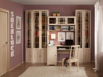 Гостиная Шерлок поможет функционально и стильно обустроить интерьер. Здесь представлено все, что необходимо для удобного хранения и плодотворной работы — множество полок за стеклянными фасадами, несколько мини-шкафчиков за глухими дверцами и просторный письменный стол.<br> Преимущества: <br> модульная коллекция — элементы могут быть расставлены в произвольном порядке;<br> регулируемые по высоте полки — вы можете установить полкодержатели в требующиеся отверстия и расставить книги и альбомы разного формата;<br> тонированное стекло толщиной 4 мм — книги защищены от воздействия солнечных лучей, пожелтения и пыли;<br> надежная конструкция — каждая полка выдерживает нагрузку до 13 кг.<br>
