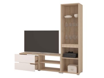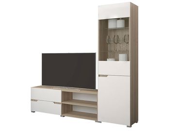 Характеристики: <br> Материал корпуса: ЛДСП.<br> Материал фасадов: МДФ с пленкой ПВХ Soft Touch.<br> Механизм открывания: распашной. Ручки отсутствуют, дверцы и ящики открываются за вырезы на фасадах.<br> Тип направляющих: роликовые.<br> Размер ниши для ТВ (ВхШ): 1244 х 1200 мм.<br> Опоры регулируются по высоте.<br> Ориентация сборки: шкаф-витрина собирается только так, как показано на изображении (дверь открывается направо); сборка ТВ-тумбы универсальна (полки можно расположить как слева, так и справа).<br> None Страна производства: Россия